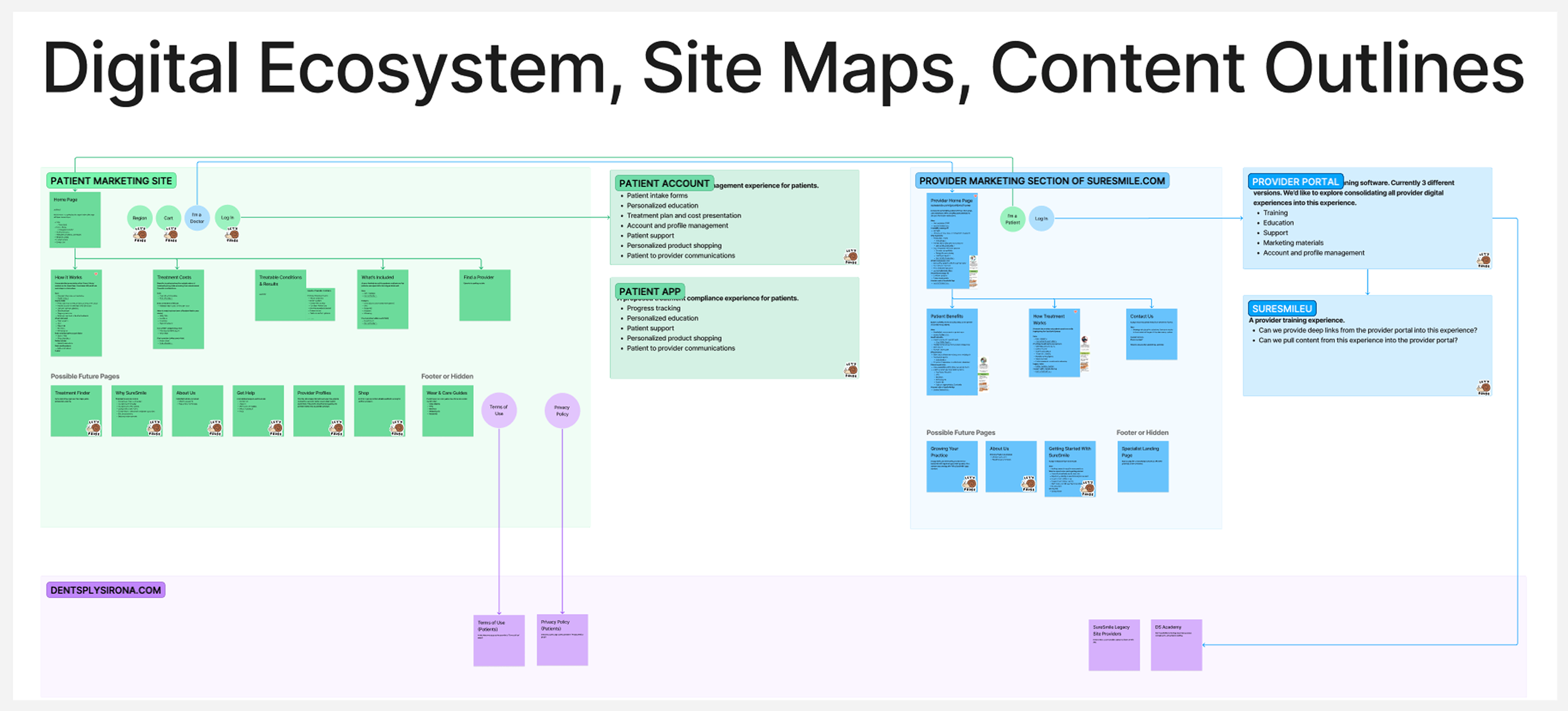 Defined SureSmile’s digital ecosystem, site taxonomy, interaction model, content strategy, and roadmap. Our approach was to simplify SureSmile’s complex messaging for both audiences and organize all information by jobs-to-be-done. Below is an ecosystem map with nested site maps and content outlines per page.